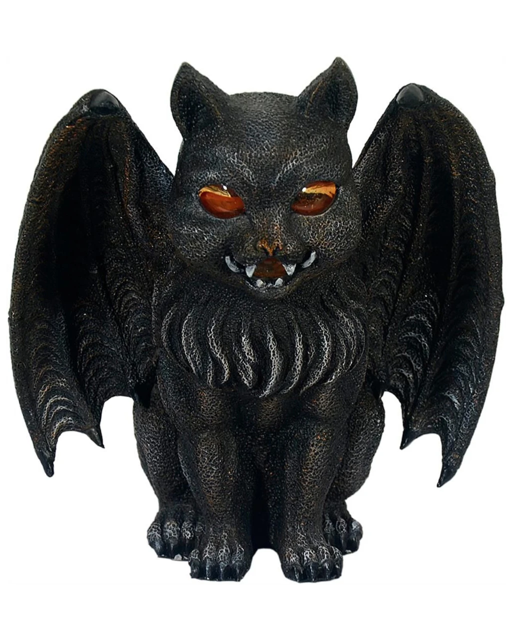 Dieser mystische Halloween Kerzenhalter ist ein ganz besonderer Blickfang. Der Teelichthalter kommt im Design einer geflügelten, schwarzen Katze und ist die perfekte Tischdeko für Halloween & Gothic Partys. Für einen besonders mystischen Effekt sorgen die Augen der Kreatur, die durch Kerzenlicht zum Leuchten gebracht werden.