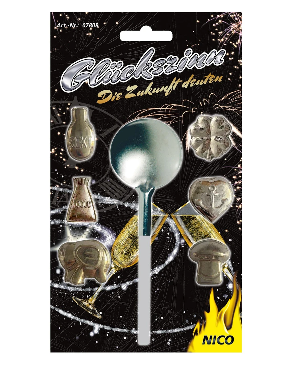 Das tolle Set zum Zinngießen besteht aus insgesamt 6 Glücksfiguren, welche aus flachem Zinn gefertigt sind, sodass die Wärme der Kerze das Zinn schneller schmelzen lässt. Neben den Figuren erhältst du einen Löffel mit Holzgriff (wird nicht heiß) und ein Orakelheft, damit du weißt, was deine geschmolzenen Figuren bedeuten. Du benötigst zum Zinn-Gieß Set also lediglich noch eine Schüssel mit kaltem Wasser und eine feuerfeste Unterlage, sowie eine Wärmequelle – z.B. eine Kerze, und schon kann es mit dem Zinngießen und dem Vorhersagen der Zukunft losgehen. Eine ausführliche Gebrauchsanweisung findest du auf der Rückseite der Verpackung. Weitere Artikel für deine Silvesterparty, wie Knicklicht Glowstick als Leuchtstab , Glitzergirlande Silber findest du bei uns.